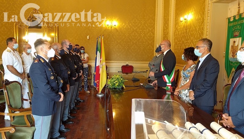 AUGUSTA – Sono stati consegnati stamani, in una cerimonia formale e ristretta tenuta nel salone di rappresentanza del palazzo di città, gli attestati di civica benemerenza a cinque uomini della Polizia di Stato che hanno condotto le indagini sull’attentato esplosivo di via Millo perpetrato in danno di una dipendente comunale, per fortuna uscita illesa.