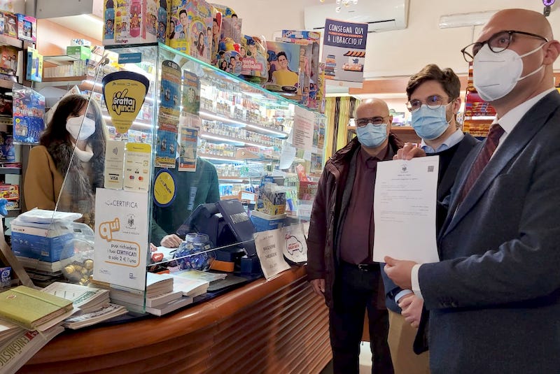 (Nella foto di copertina: il rilascio del primo certificato anagrafico in tabaccheria al sindaco Di Mare, accanto l’assessore Sicari e Maltese)
