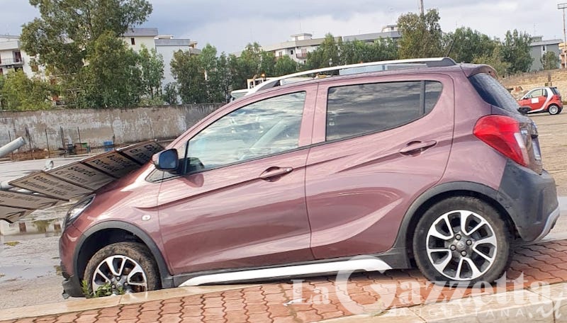 L’auto modello Hyundai i10, con a bordo un uomo e una donna, ha perso il controllo sul fondo stradale ancora bagnato per le copiose precipitazioni precedenti. Secondo una prima ricostruzione, il mezzo ha scavalcato il marciapiede tra la rotatoria e il piazzale esterno dell’ex campo sportivo “Fontana”, finendo per abbattere il cartellone stradale che indica alcune sedi istituzionali.