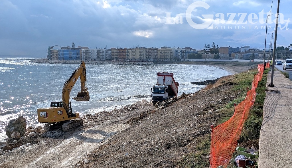 AUGUSTA – Proseguono senza sosta i lavori per le opere di difesa della costa di levante dell’Isola, soggetta ad annosi fenomeni di dissesto idrogeologico per l’erosione marina. Il cantiere, avviato solo a fine luglio per ritardi connessi alle procedure di acquisizione di 12mila metri quadri di aree costiere private, si è spostato dalla ormai completata rifioritura della scogliera radente sul lungomare Paradiso, che ha generato qualche critica sui social per l’altezza sulla sede stradale, alla stabilizzazione in corso dei pendii adiacenti a via Xifonia.
