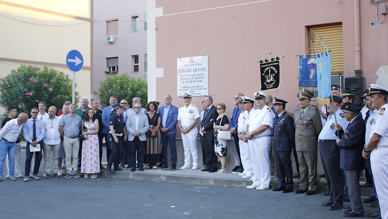 Presenti i familiari di Ciro Artoni, che hanno esposto per la durata della cerimonia il medagliere dell’ardito, e associazioni combattentistiche e d’arma. A scoprire l’epigrafe, insieme al primo cittadino, l’ammiraglio di divisione Andrea Cottini, comandante Marisicilia. A seguito di più ampio atto deliberativo della giunta, la strada, comunale dallo scorso anno, su cui insiste la tabella marmorea è denominata via Ten. Cesare Artoni.