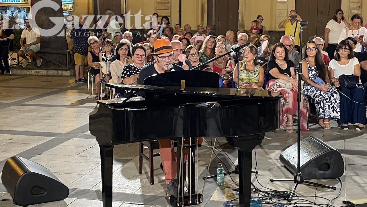 AUGUSTA – Il cantautore genovese Francesco Baccini, ieri sera, venerdì d’agosto, ha intonato alcuni dei suoi successi accompagnandosi con il pianoforte al centro della piazza Duomo, tra due ali di sedie riempite, soprattutto, dai poeti “federiciani” presenti in città per il fine settimana.