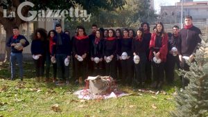 L’iniziativa dell’istituto guidato dal dirigente scolastico Renato Santoro, a cui hanno partecipato alunni di tutte le classi con i rispettivi docenti, si è svolta alle 11 di stamani, nel cortile della cittadella degli studi. Sulla porzione di prato, è stato riprodotto scenograficamente l’inghiottitoio carsico tipico della foiba, attorno al quale i ragazzi delle quinte A e B del liceo scientifico, con costumi da uniforme e una sciarpa rossa al collo a richiamare le truppe titine, hanno indossato maschere bianche a voler simboleggiare quei partigiani “senza volto, senza cuore e senza coscienza, indottrinati all’odio, alla xenofobia”, come ha spiegato la docente Ornella Spina, che ha preparato e coordinato l’iniziativa con il supporto del dipartimento di storia e filosofia.