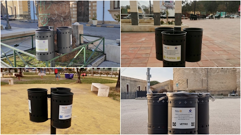 Si tratta di quattro tris di cestini, per plastica, vetro e carta, in lamiera d’acciaio zincato, che sono stati installati dalla squadra lavori comunale in piazza Duomo nel centro storico, nelle piazze Fontana e Unità d’Italia alla Borgata e in piazza Castello a Brucoli (vedi collage di copertina).