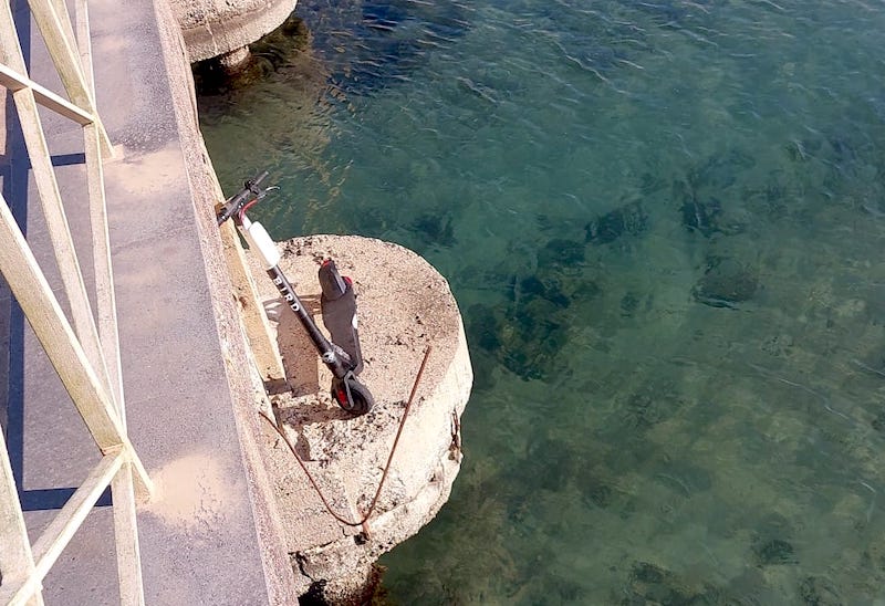 AUGUSTA – Un monopattino elettrico abbandonato, presumibilmente nella notte tra sabato e questa domenica, su un plinto di fondazione del ponte al Rivellino, esposto al moto ondoso del golfo Xifonio.
