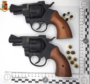 Durante la fase di esecuzione della misura, l’uomo è stato sottoposto a perquisizione personale e domiciliare, così gli agenti hanno rinvenuto nella sua disponibilità due revolver a salve (nella foto all’interno, ndr), prive del tappo rosso che le renda distinguibili da armi vere. Nel prosieguo della perquisizione, anche diverse cartucce vere calibro 7,65. Il Lanzafame è stato pertanto denunciato per detenzione abusiva di armi.