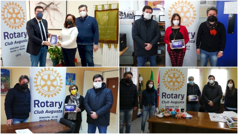 La delegazione del Rotary club Augusta, composta dal presidente Pietro Forestiere e dal co-segretario Francesco Messina, ha consegnato un tablet ciascuno al primo collaboratore del dirigente scolastico dell’Istituto comprensivo “Principe di Napoli” prof.ssa Anna Forte (in vece della dirigente dott.ssa Agata Sortino), alla dirigente scolastica dell’Istituto “Orso Mario Corbino” prof.ssa Maria Giovanna Sergi, alla dirigente scolastica dell’Istituto “Salvatore Todaro” prof.ssa Rita Spada e al dirigente scolastico dell’Istituto “Domenico Costa” prof. Michele Accolla (vedi collage di copertina).