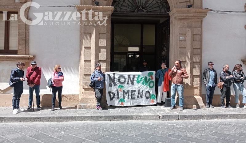 AUGUSTA – Si sono ritrovati stamani per un sit-in dinanzi al portone del palazzo di città su via Principe Umberto, per rilanciare la protesta contro il taglio di alberi avviato in piazza Mattarella oggetto di lavori di riqualificazione.
