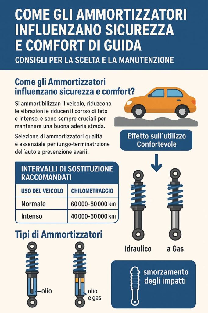 L’infografica illustra in modo chiaro il funzionamento degli ammortizzatori e il loro impatto sulla sicurezza stradale. Come mostrato nel grafico, questi componenti fondamentali si ammortizzano il veicolo, riducono le vibrazioni e mantengono il controllo durante la guida. La tabella evidenzia gli intervalli di sostituzione raccomandati: per uso normale 60.000-80.000 km, mentre per uso intenso si riducono a 40.000-60.000 km. L’infografica confronta anche i due tipi principali – idraulico e a gas – mostrando come entrambi contribuiscano allo smorzamento degli impatti per un utilizzo confortevole del veicolo.
