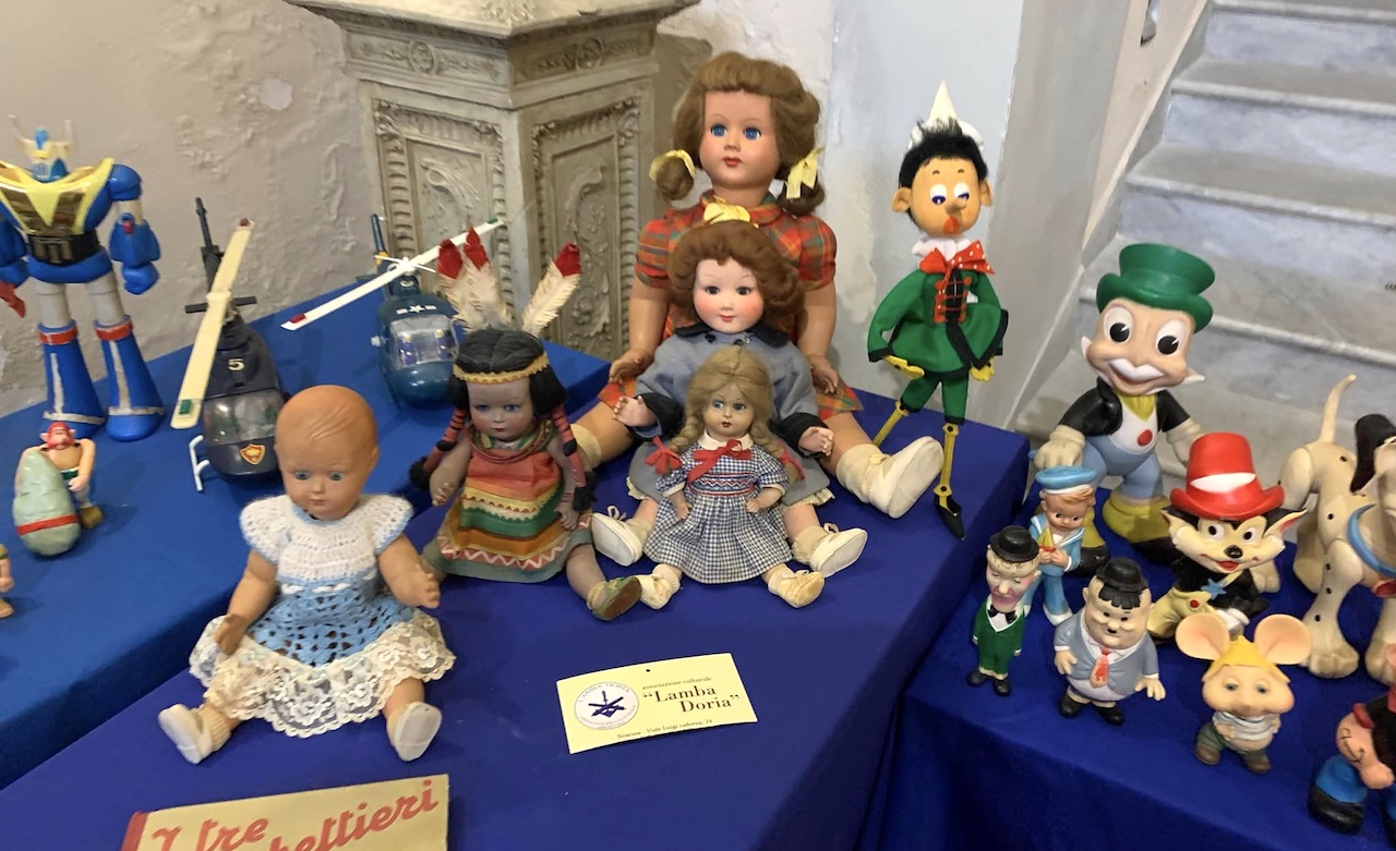(Nella foto di copertina: mostra di giocattoli d’epoca attualmente allestita dall’associazione “Lamba Doria” nell’androne su piazza Duomo del palazzo di città)