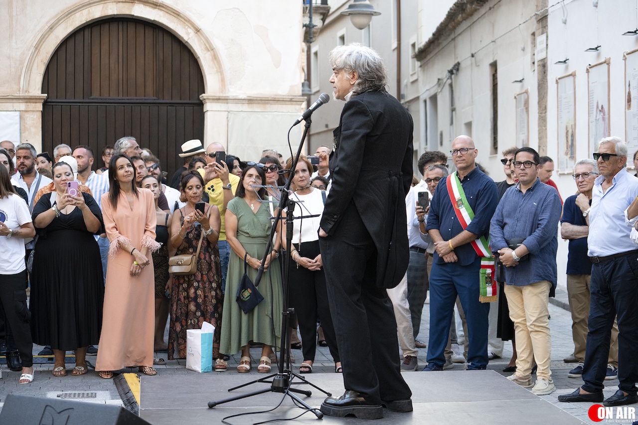 L’artista ha assistito alla scopertura di una stele di ceramica maiolicata che reca il testo di Altrove (2003), uno dei suoi brani più celebri, quale riconoscimento fuori concorso nell’ambito della 17ª edizione del premio internazionale di poesia inedita “Il Federiciano“.