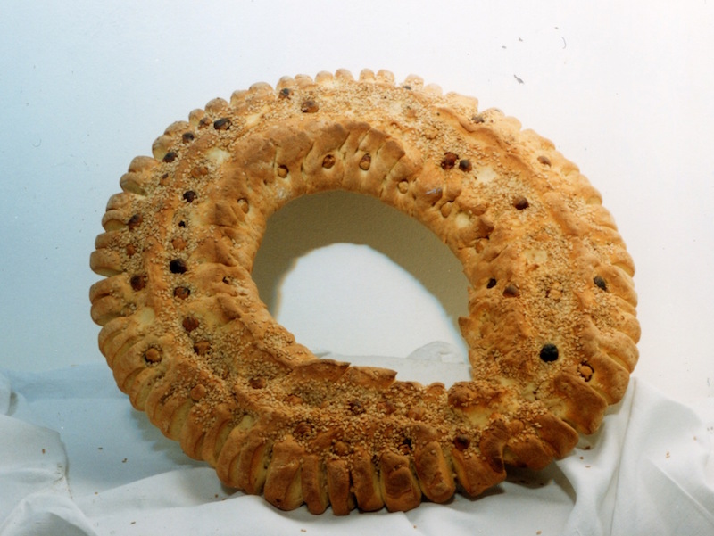 Delle antiche panificazioni natalizie i più anziani ricordano il cosiddetto “pani de’ uoi”, che pesava all’incirca un chilo e veniva consumato nel pranzo di Capodanno. Questa forma di pane, ottenuta da due elementi a mezza luna, voleva rappresentare due buoi aggiogati da un cordoncino di pasta a treccia. La raffigurazione dei buoi nei pani, come ampiamente descritto da Antonino Uccello nel suo saggio Pani e Dolci di Sicilia (Sellerio editore, Palermo 1976), ha un carattere rituale e si collega ai pani e alle focacce delle antiche civiltà cerealicole a forma di animale, che venivano mangiati come corpo-spirito del grano.