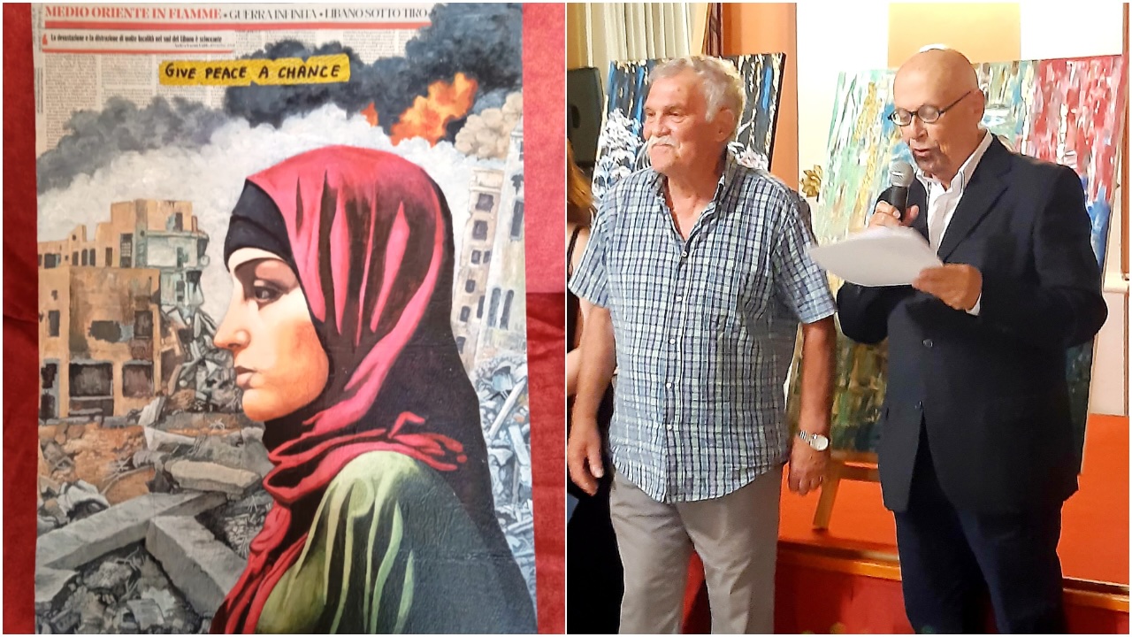 Tra le numerose opere che saranno esposte a Priolo emerge un interessante quadro che affronta un tema attualissimo, dal titolo “Medio oriente in fiamme“, con un volto di ragazza palestinese sullo sfondo delle rovine di Gaza (vedi collage di copertina, a sinistra), a testimoniare l’impegno dell’autore per le problematiche contemporanee.