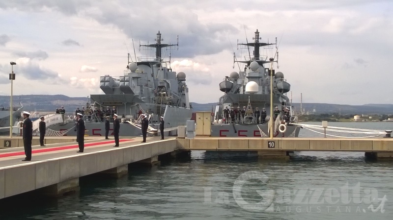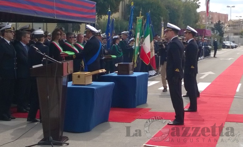 Una cerimonia solenne anticipata dal discorso commosso del tenente di vascello Fausto Marletta, comandante delle due navi, seguito dal comandante in capo della Squadra navale, l’ammiraglio Filippo Maria Foffi. Questi ha sottolineato il grande valore degli uomini della base della Marina Militare di Augusta, attivamente coinvolti a salvaguardia degli interessi nazionali marittimi e distinguendosi, in particolare, negli interventi umanitari dell’operazione Mare Nostrum. Ha aggiunto: “Solidarietà e accoglienza […] determinazione e senso di responsabilità, con cui gli uomini della Marina Militare continuano a operare, sono motivo di orgoglio nazionale”. Presenti alle cerimonia le autorità civili e militari, dal sindaco Cettina Di Pietro al contrammiraglio Nicola De Felice, comandante di Marisicilia.