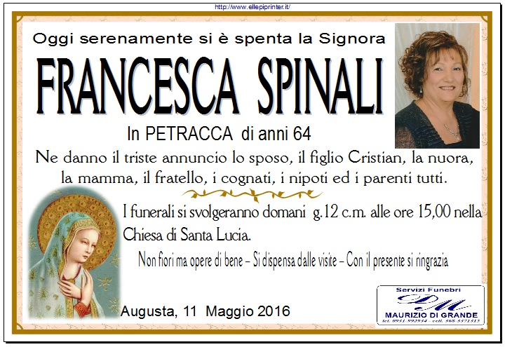 Necrologi – Si è spenta la signora Francesca Spinali in Petracca di anni 64