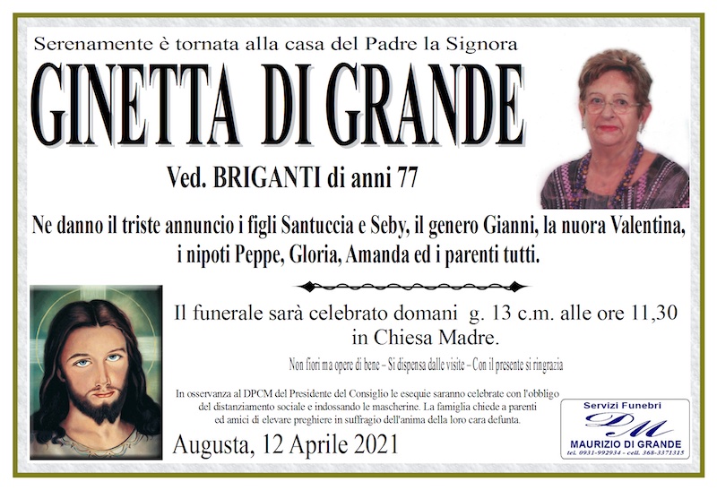 Necrologi – Si è spenta la signora Ginetta Di Grande di anni 77
