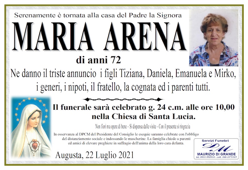 Necrologi – Si è spenta la signora Maria Arena di anni 72