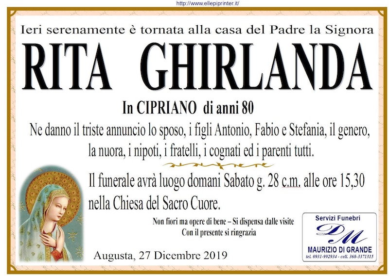 Necrologi – Si è spenta la signora Rita Ghirlanda di anni 80