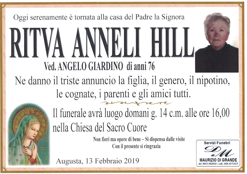 Necrologi – Si è spenta la signora Ritva Anneli Hill di anni 76