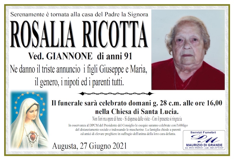 Necrologi – Si è spenta la signora Rosalia Ricotta di anni 91