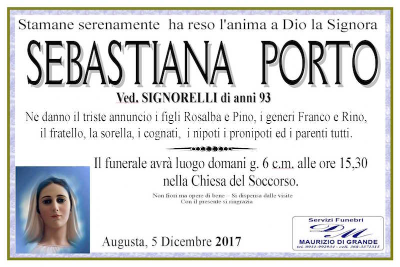 Necrologi – Si è spenta la signora Sebastiana Porto di anni 93