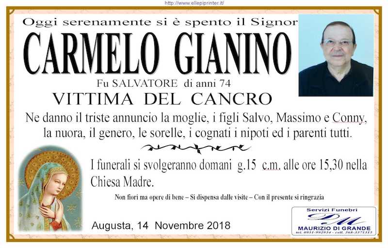 Necrologi – Si è spento il signor Carmelo Gianino di anni 74