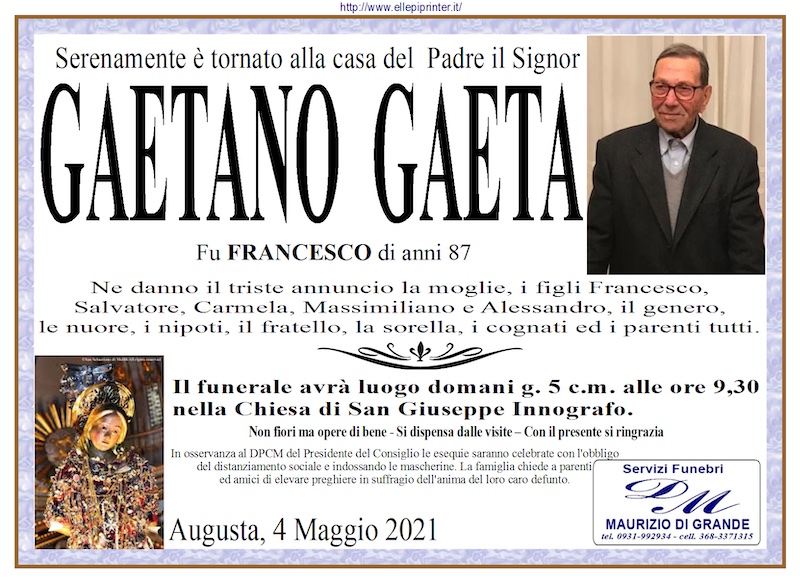 Necrologi – Si è spento il signor Gaetano Gaeta di anni 87