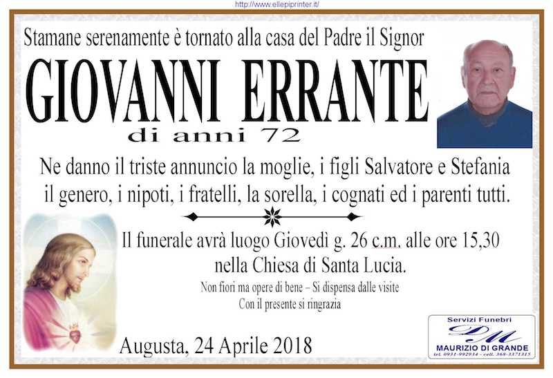 Necrologi – Si è spento il signor Giovanni Errante di anni 72