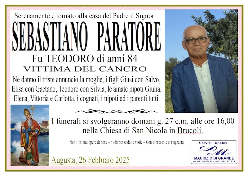 Necrologi – Si è spento il signor Sebastiano Paratore di anni 84