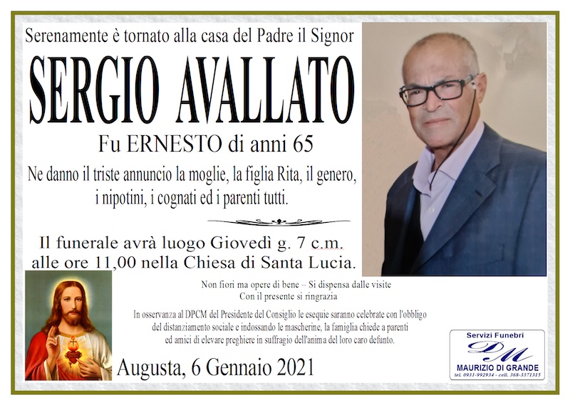 Necrologi – Si è spento il signor Sergio Avallato di anni 65