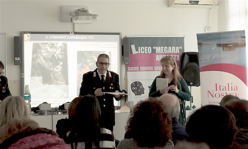 AUGUSTA – Si è trattato di un bagno di consapevolezza la lezione tenuta lunedì 30 gennaio al Liceo “Megara” di Augusta dal comandante della Sezione Carabinieri Tutela patrimonio culturale di Siracusa maresciallo aiutante Maurizio Cassia, in occasione del quarto incontro nell’ambito del corso di formazione nazionale per docenti dal titolo “Le pietre e i cittadini”, promosso dalla sezione locale dell’associazione “Italia nostra“, egregiamente coordinato dalla docente Jessica Di Venuta.